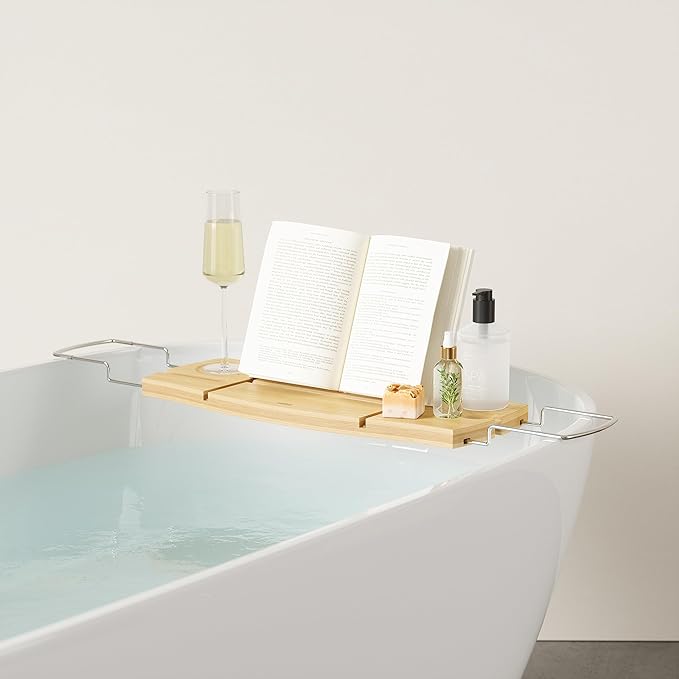 Umbra Aquala Bathtub Tray Extendable Caddy with Book Stand and Wine Glass Holder, Natural