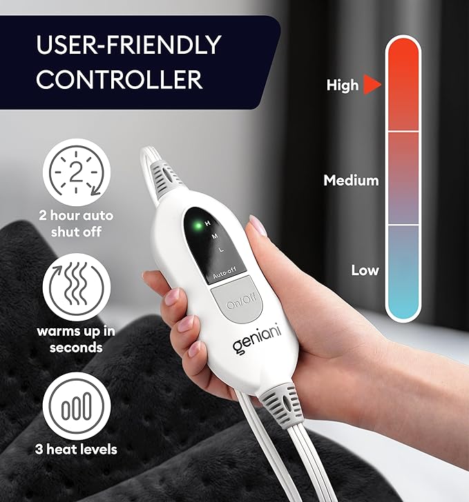 GENIANI Electric Heating Pad for Back Pain & Cramps Relief, Electric Throw, Auto Shut Off, Machine Washable, Moist Heat Pad for Neck & Shoulder - Valentines Day Gifts for Her (12'‘×24" Black)