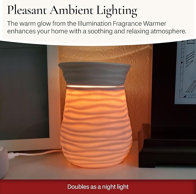 - PLEASANT AMBIENT LIGHTING – The warm glow from the Illumination Fragrance Warmer provides inviting ambient lighting that enhances your home decor. The combination of porcelain and a long lasting halogen bulb creates a soothing atmosphere for relaxing in any room. This elegant design combines function and style seamlessly.