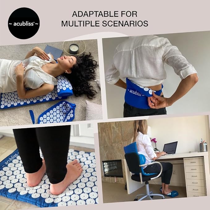 - ACUBLISS ACUPRESSURE MAT, STRAP + PILLOW: Acubliss Mat is designed with 8820 premium nails, the strap with 1848 nails, and the pillow with 2142 nails, using 42 non-toxic nails on each plate (rather than 25 like most others) stimulating more pressure points with less intensity, providing more benefits and less pain.