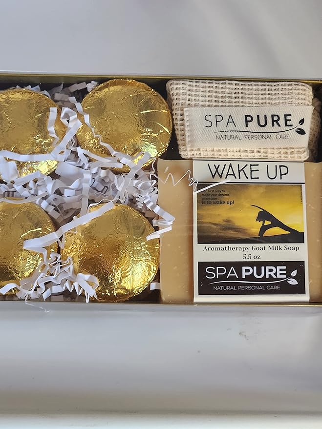 Spa Pure Aromatherapy Gift Set: Wake Up Large Artisan soap, 4 Shower Steamers, made with plant based ingredients, includes Cotton Steamer Bag & Soap Bag