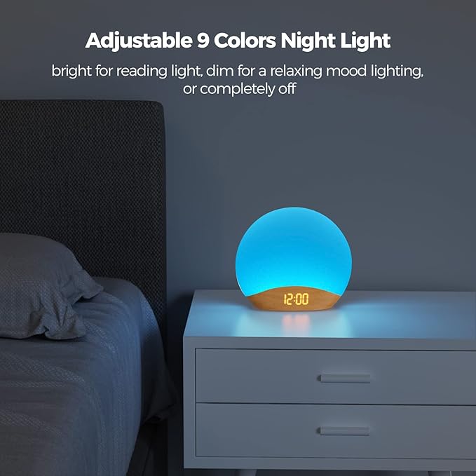 - 【Upgrade Your Mornings with Sunrise Wake-Up Light】- Transform your wake-up routine with the natural progression of sunrise as the wake-up light gradually illuminates, offering a customizable sunrise duration of 5-60 minutes before your alarm time. Say goodbye to jarring alarms and enjoy pleasant mornings with 3 optional alarm sounds or a silent, sunrise-only wake-up call.