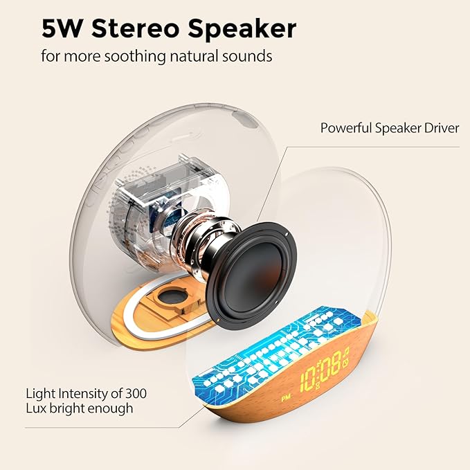 - 【Better Sleep, Wake Energized, Affordable Price】- Experience more natural sounds to help you relax and fall asleep easily, wake up gently to a brighter 300 lux light,to be a morning person whatever the season! Plus, affordable price with wooden design, new addition to your bedroom.