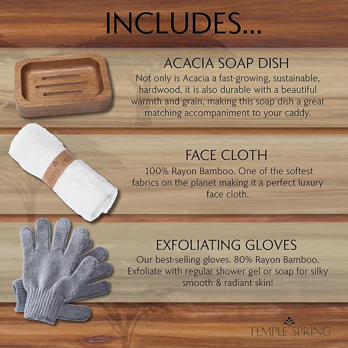 - COMPLETE HOME SPA SET — INCLUDES MATCHING SOAP DISH, FACE CLOTH AND EXFOLIATING GLOVES: Everything you need for a full spa experience arrives in one box — the expandable acacia bathtub tray plus a matching soap dish to keep your favorite bar within reach, a soft face cloth for cleansing, and natural exfoliating gloves to pamper your skin while you soak — most bath trays arrive empty and leave you hunting for accessories, but Temple Spring gives you a complete spa ritual ready to enjoy the moment you open it