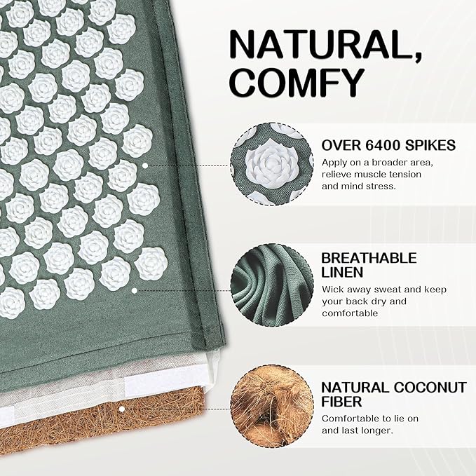 - 【 MORE NATURAL, MORE COMFORTABLE 】- This pressure point mat features a breathable linen cover and natural coconut fiber stuffing to keep you dry and comfortable even when you sweat. The buckwheat husk pillow conforms to the shape of your head and neck for superior comfort and neck pain relief