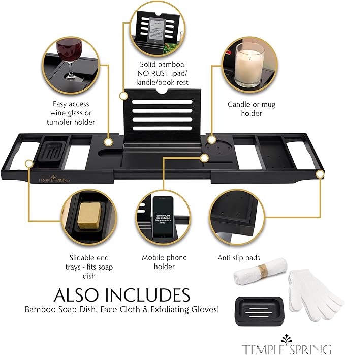 Temple Spring Wooden Bathtub Tray, Bamboo Bathroom Accessories, Bath Tray for Tub, at Home Spa Essentials, Board for Tub Table, Bath Caddy for Bathtub Accessories & Bathroom Essentials – Black