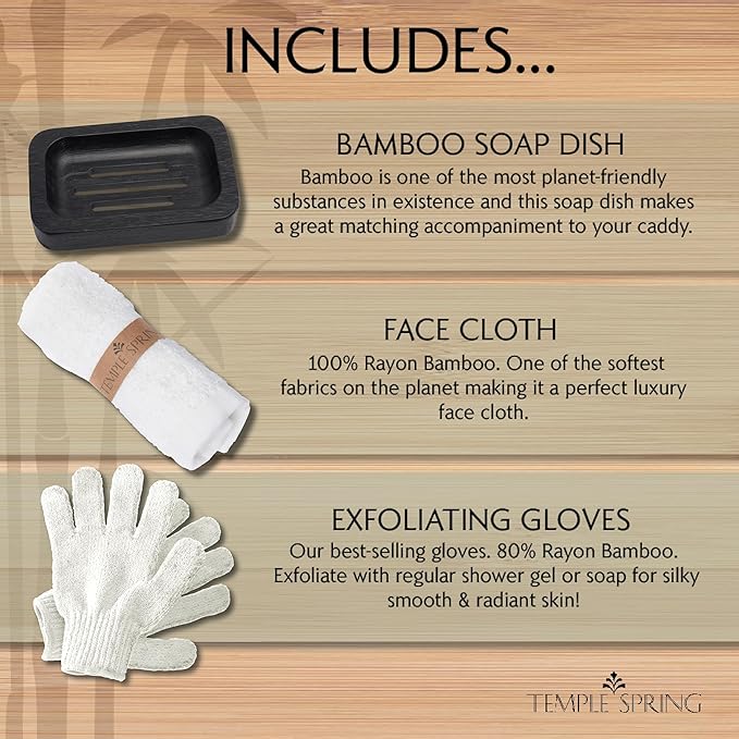 - INCLUDES MATCHING BAMBOO ACCESSORIES - Each purchase includes a matching bamboo soap dish, face cloth, and exfoliating gloves for added convenience. Pair this wooden tray with your favourite bathtub accessories to complete your bathroom tray setup.