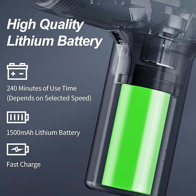- massage gun is equipped with a powerful 1500 mAh lithium battery and comes with a USB charging cable (charging plug not included) Continuous use for up to 6 hours (depending on the selected speed) The deep tissue massager will automatically stop running after 15 minutes of continuous use. Provide thoughtful protection for your health and effectively protect battery life