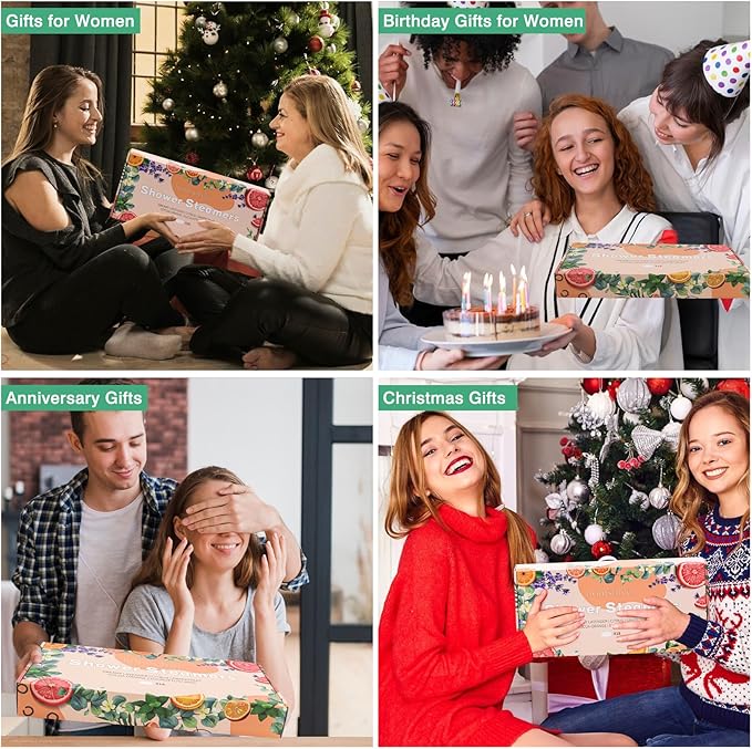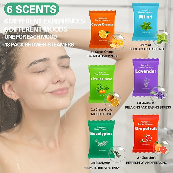 - Shower Steamers of 18 Packs: Shower steamers 18 packs gifts set box are 3 individual bags with 6 different scents eucalyptus, mint, lavender, grapefruit, cocoa orange, and citrus grove. They are essential oils extracted from natural plants and fruits, high density, long lasting, and refreshing fragrances. After a busy day, relax and unwind with these shower steamers aromatherapy, which makes you feel relaxed and comfortable, and relieves relief. It is the unique best gifts for women