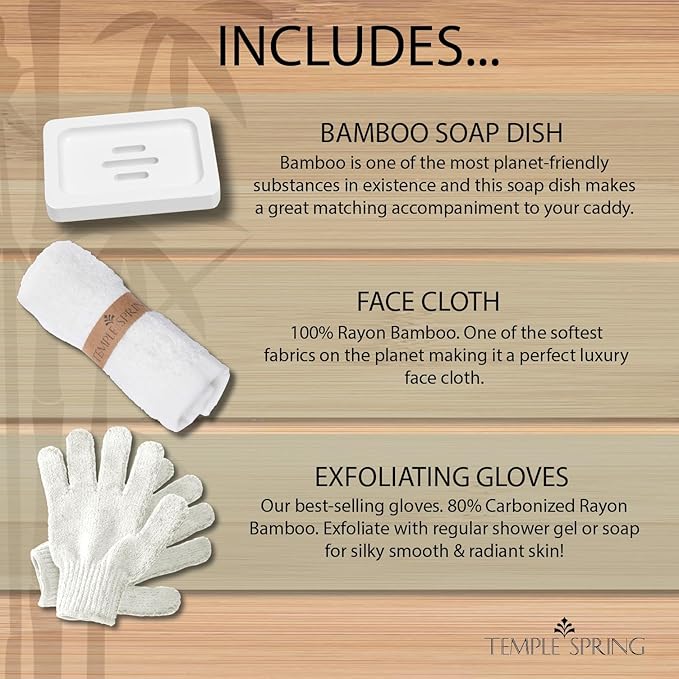 - INCLUDES MATCHING BAMBOO ACCESSORIES - Each purchase includes a matching bamboo soap dish, face cloth, and exfoliating gloves for added convenience. Pair this wooden tray with your favourite bathtub accessories to complete your bathroom tray setup.