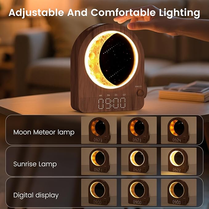 Sunrise Alarm Clock, White Noise Machine & Meteor Moonlight - 10 Soothing Sounds, Dual Alarms, 30/60/90min Timer, Easy Snooze - Bedroom Gift for Insomnia Adults/Women - Walnut