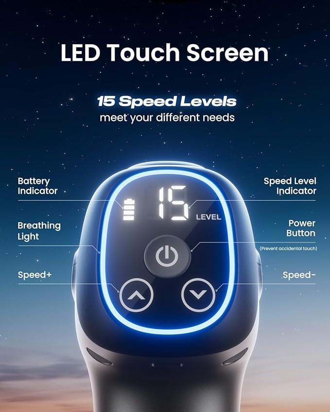- Ultra-long Battery Life & Smart LED Touchscreen: Our muscle massage gun offers an impressive battery life of up to 10,000 hours.The HD LED touchscreen allows you to easily monitor speed levels and remaining battery power at any time.