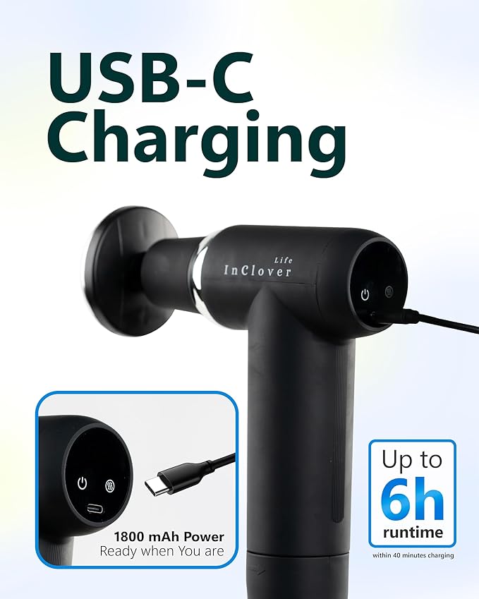- QUIET, HANDHELD & PORTABLE DESIGN - Enjoy a peaceful massage gun session anytime with ultra-quiet operation under 45 dB. The ergonomic swan-neck handle ensures a firm, non-slip grip, while USB-C rechargeability provides long battery life for home, gym, or travel use.