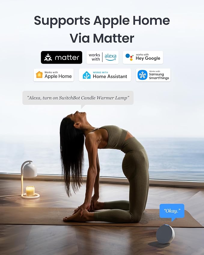 - Global First Smart Voice Control: Enjoy the world’s first smart candle warmer with voice—no more fumbling for remotes. Use the SwitchBot app or Siri voice command to dim 1%–100%, set precise on/off schedules, or launch fragrance scenes remotely— perfect for bedtime, office focus or dorm life. Please note: candle not included.