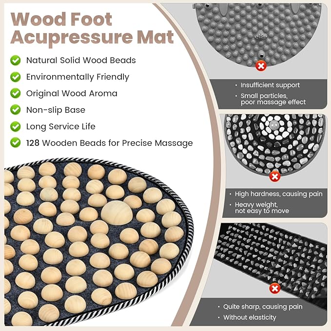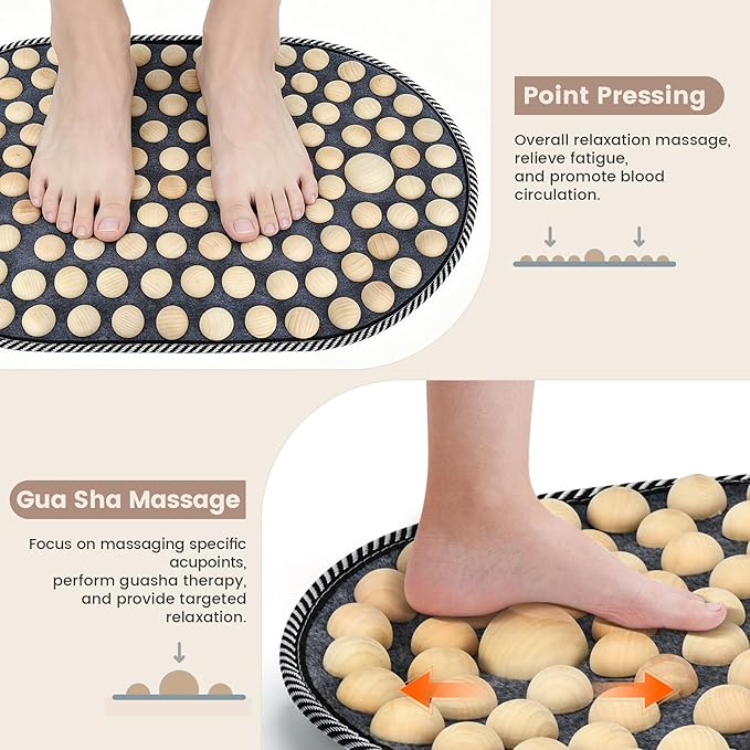 - PRECISION STIMULATION: There are 126 small wooden beads and 2 large wooden beads on the reflexology mat, which can aim at key reflex points and fully take care of each acupoint. Small wooden beads can be used for gentle foot relaxation, while large wooden beads can help you precisely stimulate acupoints. Bringing you a professional level foot massage experience.