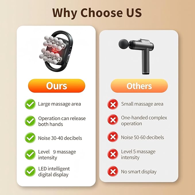- 【Large Massage Area & Hands-Free Operation】Enjoy full-body relief with a spacious 33,450mm² massage area and a hands-free design. This back massager gun effortlessly targets your shoulders, back, legs。